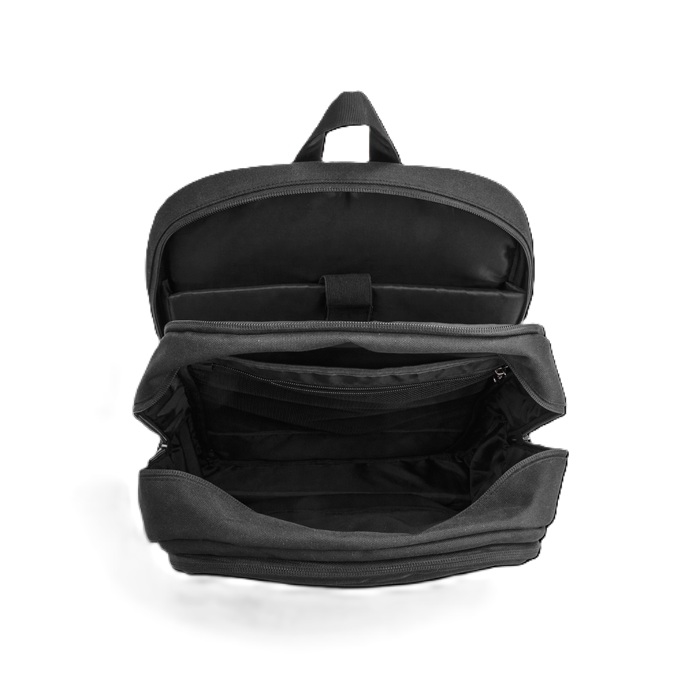 Indvendigt: Polstret rum til bærbar computer op til 16" samt flere åbne og lynlåslommer. Foran: Skjult lynlåslomme.