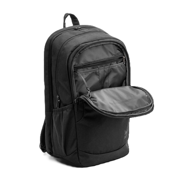 Rummelig, sporty og vidunderligt velorganiseret rygsæk i vandafvisende 900D polyester fra Escape Nordic. Tre hovedrum med lynlåse. Bagsiden har et åbent, polstret laptoprum, midten har et dybt, åbent rum og et robust lynlåsrum, og forsiden har to åbne lommer, en lynlåslomme, to penholdere og en karabinhage til en nøglering. På siderne af tasken finder du åbne lommer, der passer til en vandflaske eller paraply. Polstrede, 6,5 cm brede, justerbare skulderstropper. Solidt polstret og ventileret bagpanel. Aftagelig og justerbar brystrem. Praktisk bærehåndtag på toppen. Perfekt til vores uforudsigelige nordiske klima.