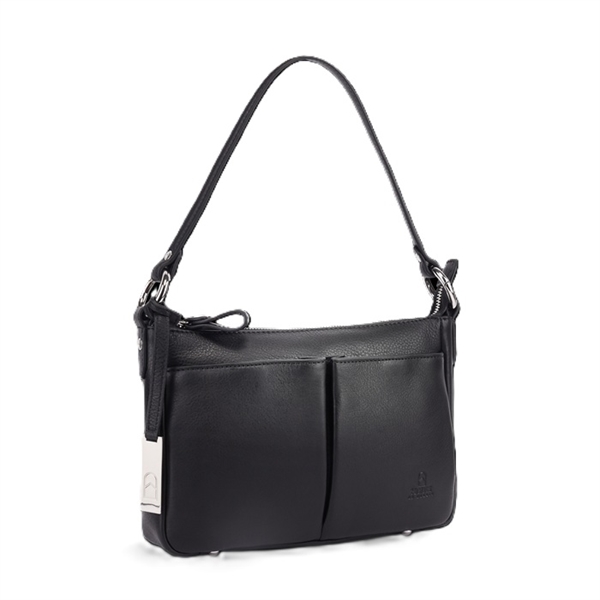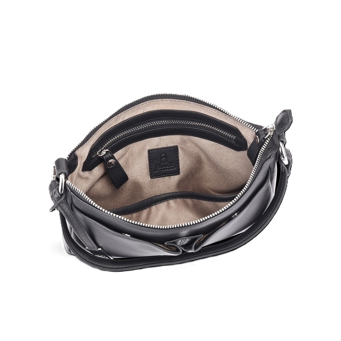 Dobbelte stropper medfølger. Lang skulderrem, der er justerbar. Forlommer med skjulte magnetiske trykknapper. Udvendig lynlåslomme. Indvendig lynlåslomme og 2 mobiltelefonlommer. Kan også bruges som clutch.